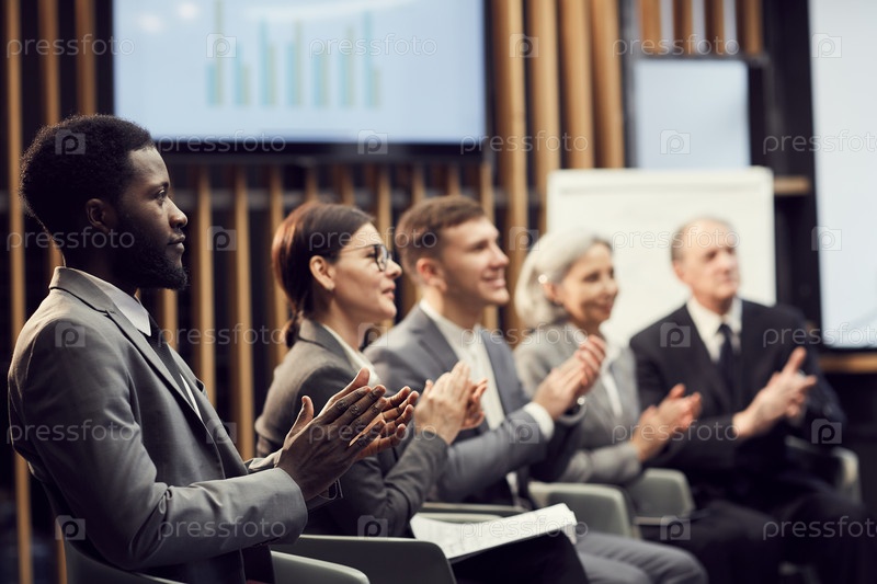 Группа контента вдохновила многонациональных бизнесменов сидеть в очереди и благодарить спикера аплодисментами после презентации на конференции
