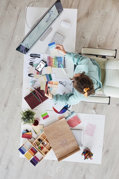 Высокоугольный вид молодой женщины в капюшоне, сидящей за столом и просматривающей палитры при выборе цветов для новых платьев
