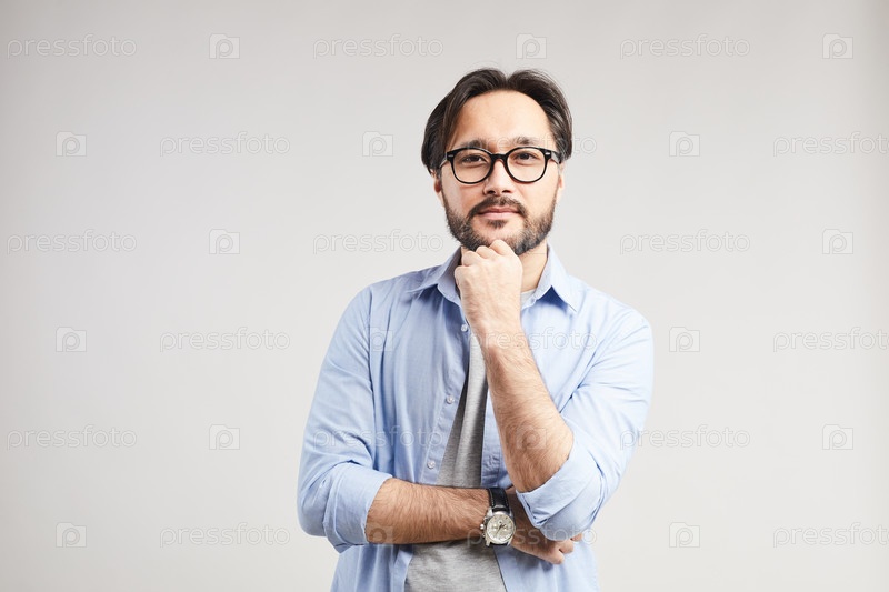 Портрет содержания предприимчивый молодой азиатский мужчина с бородой, носящий неформальную рубашку и очки, касающийся подбородка в мыслях