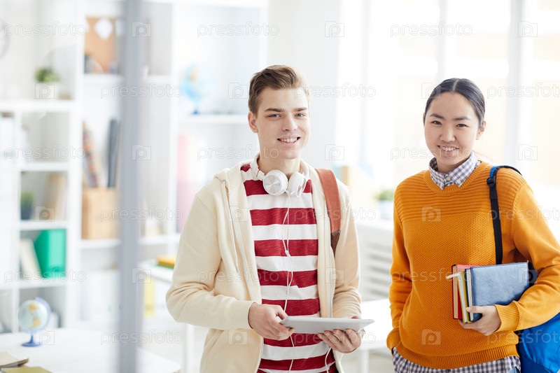 Веселые, уверенные в себе молодые студенты из разных этнических групп в непринужденной одежде стоят в современном классе и смотрят на камеру