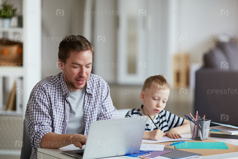 Серьезный блондинский сын сидит за столом и рисует на бумаге, в то время как его отец работает с ноутбуком дома