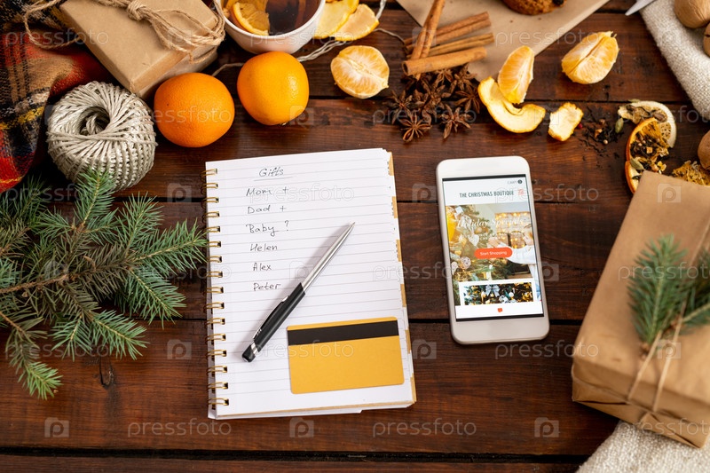 Смартфон с промокодом, блокнот, пена и кредитная карта среди рождественских вещей на столе