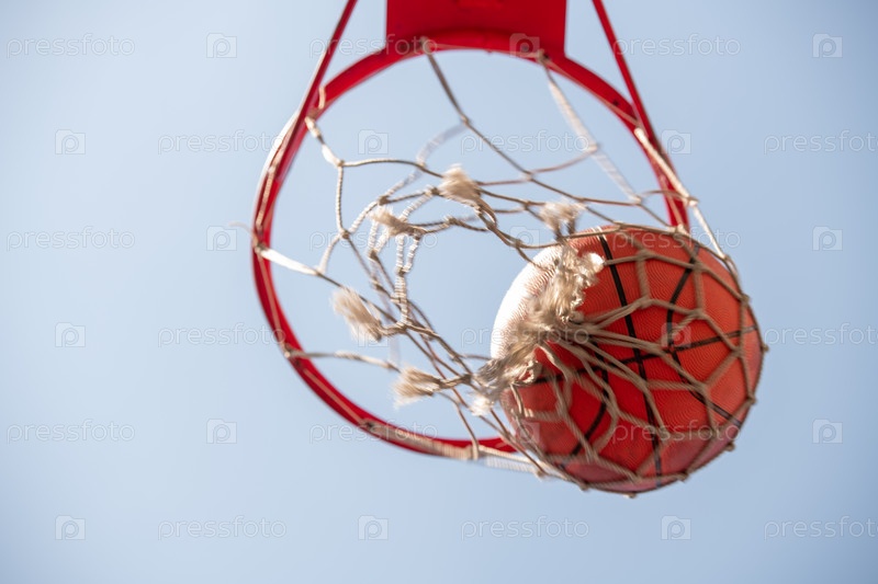 Мяч в баскетбольной сетке с светло-синим безоблачным небом на фоне