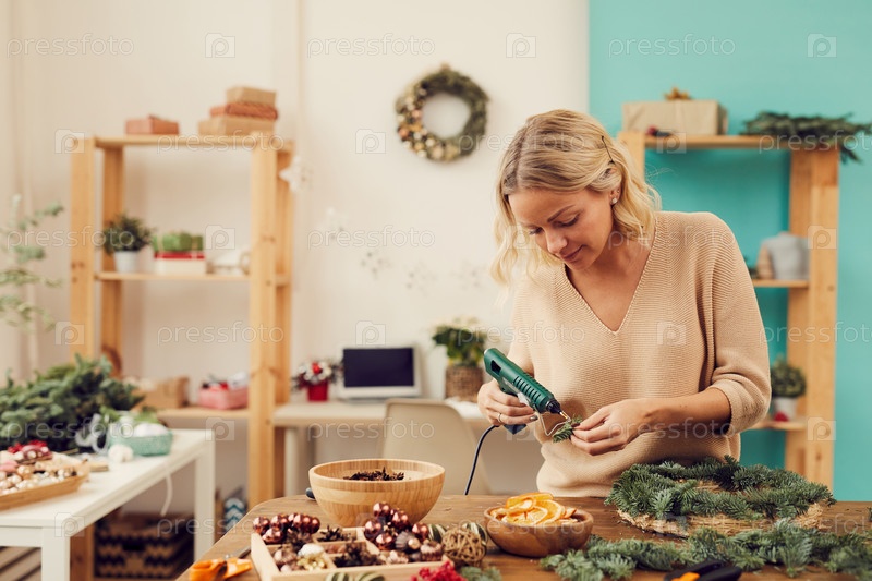 Содержание красивая молодая женщина в свитере, стоящая в ремесленной студии и использующая клей от горячего пистолета во время изготовления рождественского венка своими руками