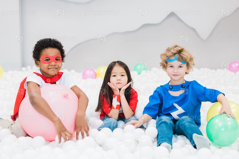 Милые маленькие межкультурные друзья в костюмах играют в детской комнате