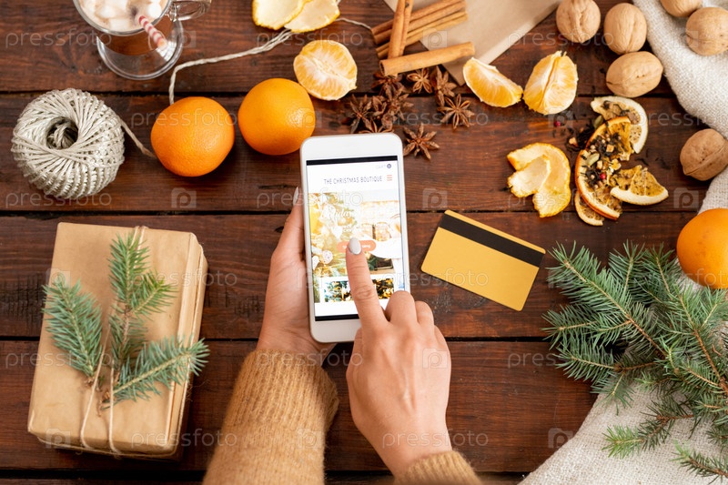 Верхний вид рук женщины, касающейся кнопки запуска на дисплее смартфона