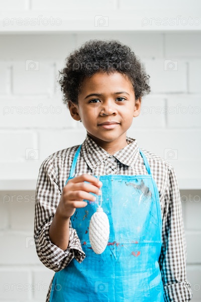 Африканский юноша в голубом фартуке, держащий белое окрашенное ручной работы xmas decoration