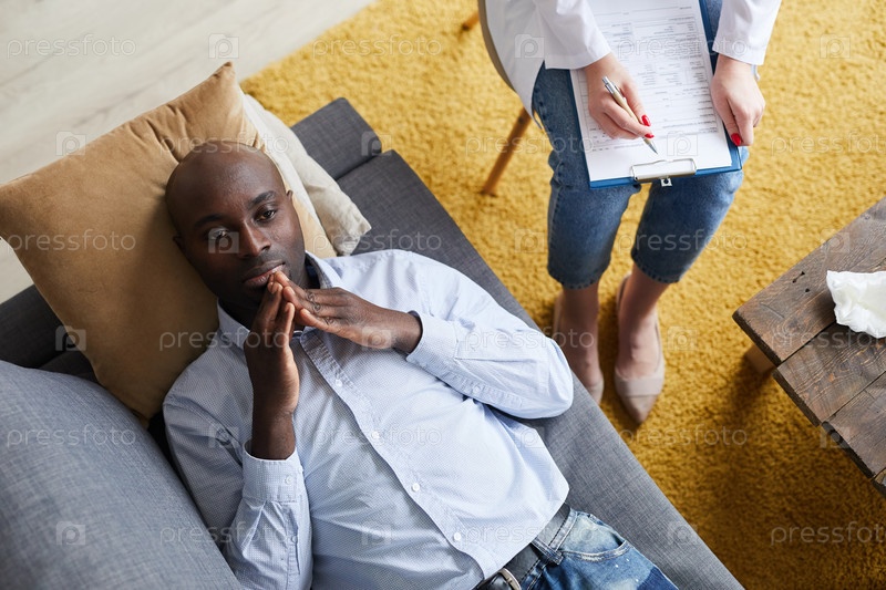Прямо над нами вид на созерцательного молодого афроамериканца, лежащего на диване и прикасающегося друг к другу пальцами в то время как он думает о вопросе психоаналитика
