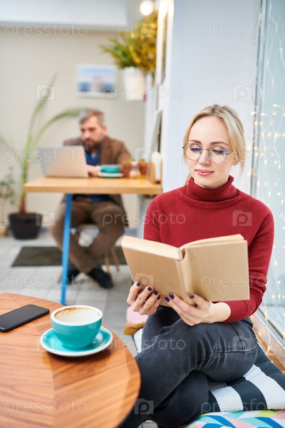 Женщина читает в кафе