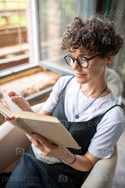 Молодая современная женщина переворачивает страницу в интересной книге, читая ее