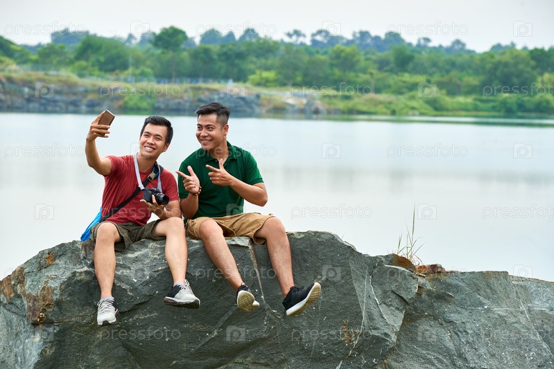 Друзья фотографируют на скале