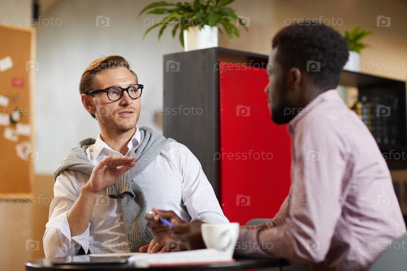 Современные молодые бизнес-специалисты сидят в открытом офисе и обсуждают маркетинговый проект