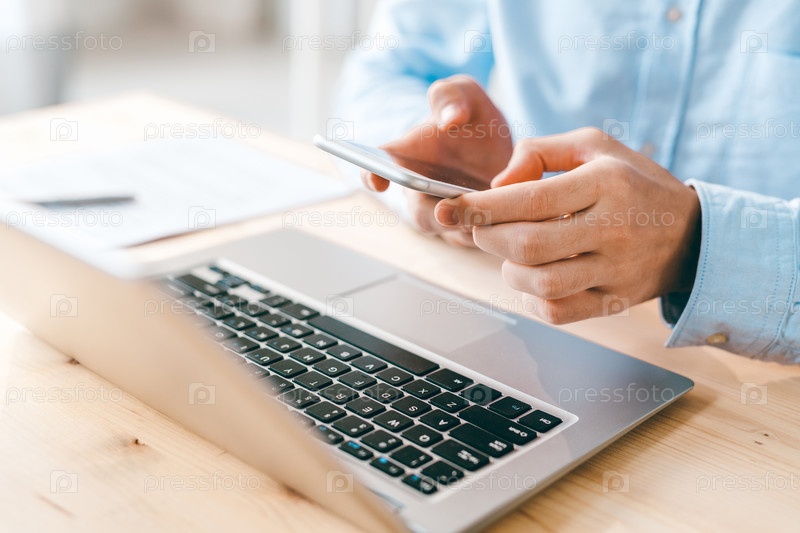 Молодой сотрудник-мужчина прокручивает или отправляет текстовые сообщения на смартфоне через клавиатуру ноутбука