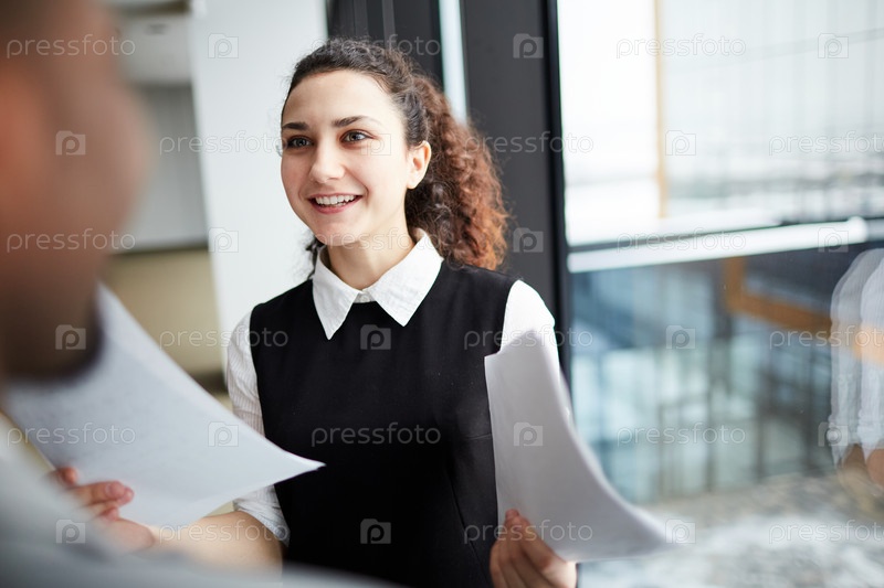 Молодая женщина держит бумаги и разговаривает с коллегой