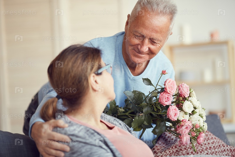 Счастливый красавчик с седыми волосами склоняется перед женой и дарит ей прекрасный букет на День святого Валентина