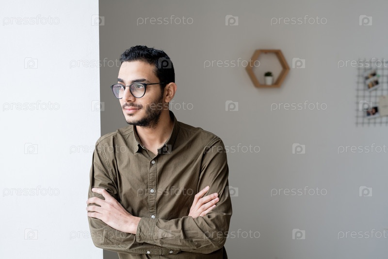Молодой бизнесмен с перекрещенными руками в очках и футболке смотрит через окно