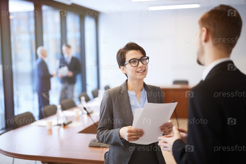 Молодая бизнесвумен разговаривает с коллегой в конференц-зале