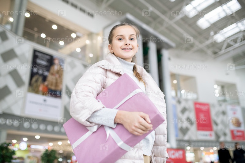 Милая улыбающаяся девушка с большой коробкой для подарков стоит перед камерой в торговом центре