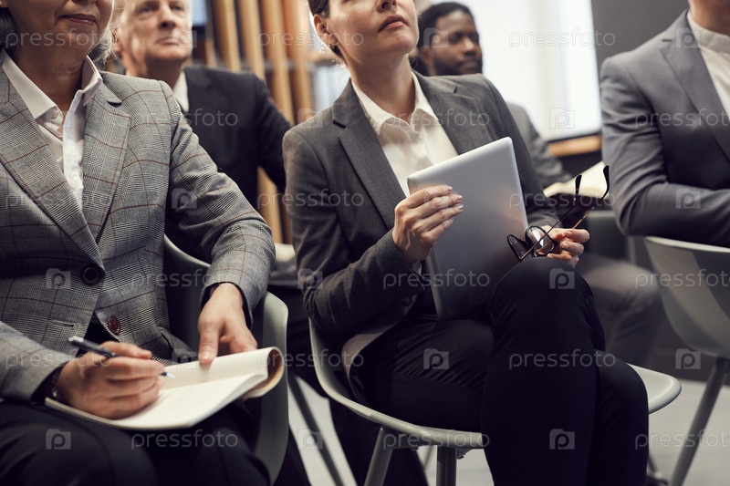 Близкий план любознательных деловых людей в формальных нарядах, сидящих на стульях и слушающих докладчика во время получения новых знаний на бизнес-конференции