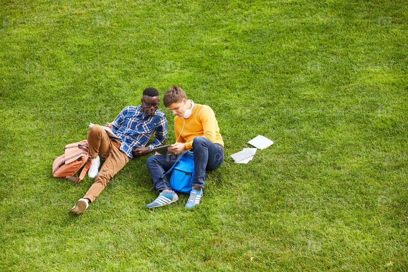 Студенты отдыхают на зеленой траве