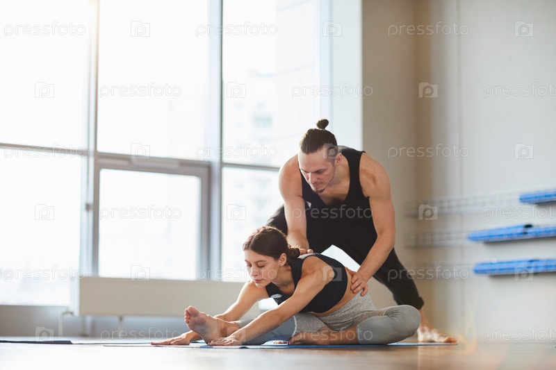 Учитель йоги помогает девочке согнуться