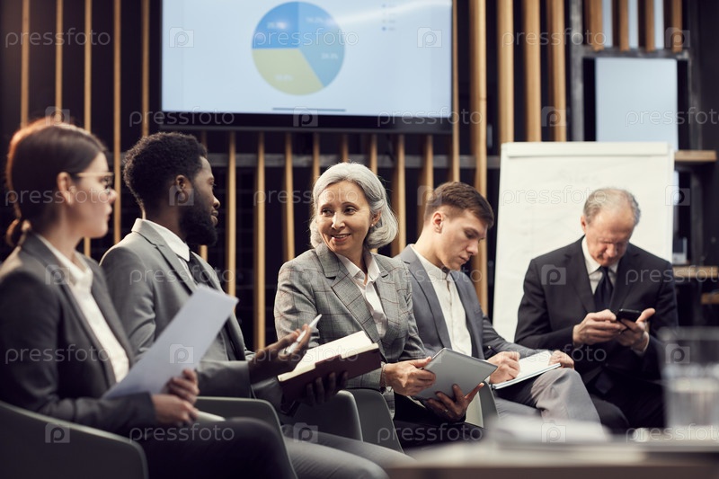 Улыбающаяся азиатская леди и афроамериканский мужчина сидят в зале заседаний и обсуждают статистику на бизнес-конференции