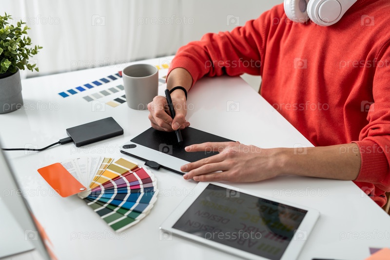 Руки современного внештатного дизайнера со стилусом над графическим планшетом