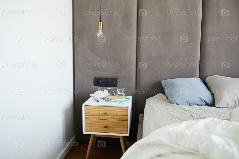 Часть кровати с белым одеялом и серыми подушками с ночным столом рядом