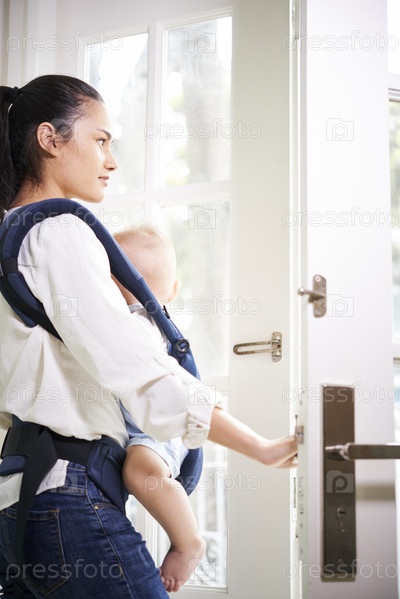 Молодая мать открывает входную дверь