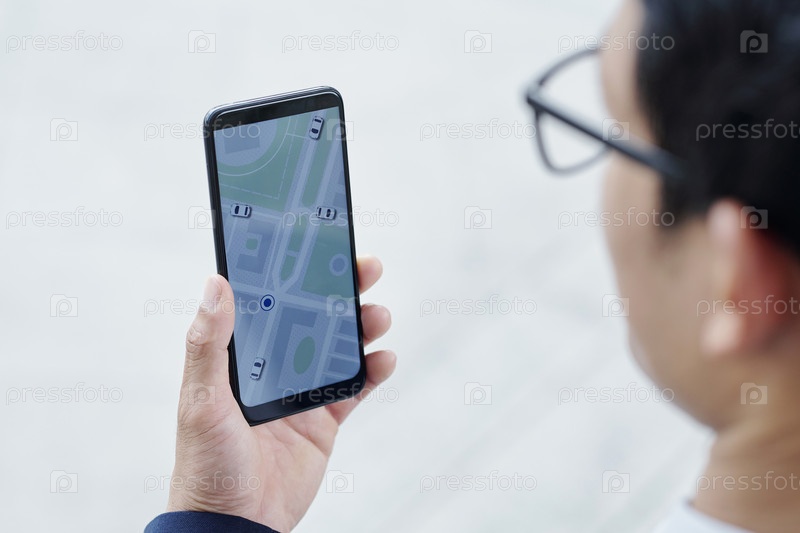 Бизнесмен заказывает такси через приложение