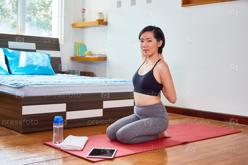 Женщина занимается спортом в спальне