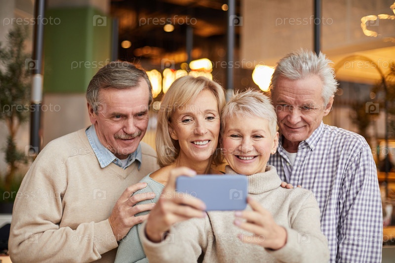 Группа счастливых старших друзей в повседневных нарядах, стоящих в современном кафе и фотографирующих вместе со смартфонами