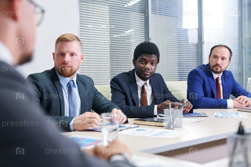 Группа уверенных в себе финансовых директоров, встречающихся в зале заседаний