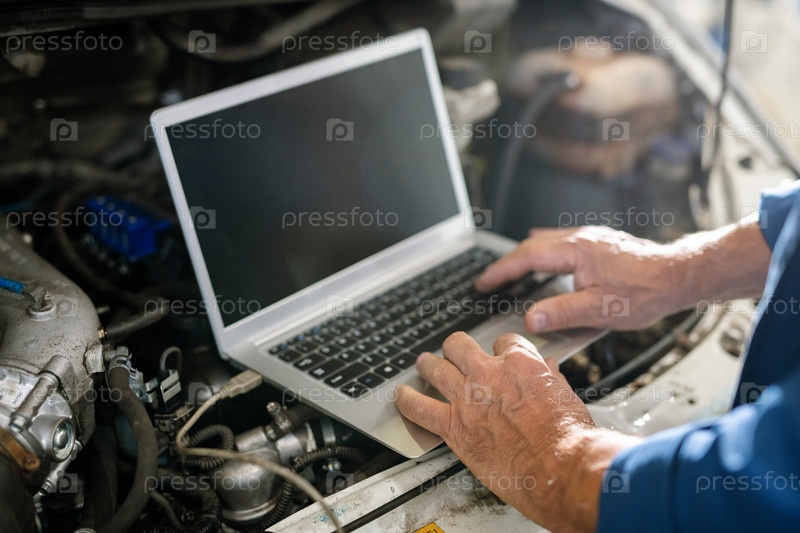 Руки зрелого мастера автомобильного ремонта через клавиатуру ноутбука