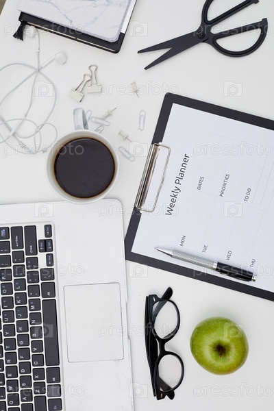 Непосредственно над видом еженедельного планировщика для бизнеса, ноутбук, булавки, наушники, ножницы, яблоко и блокноты на белом столе