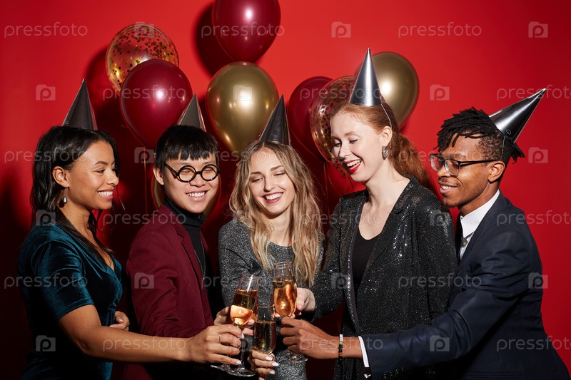 Мультиэтническая группа друзей, приносящих тосты на вечеринке