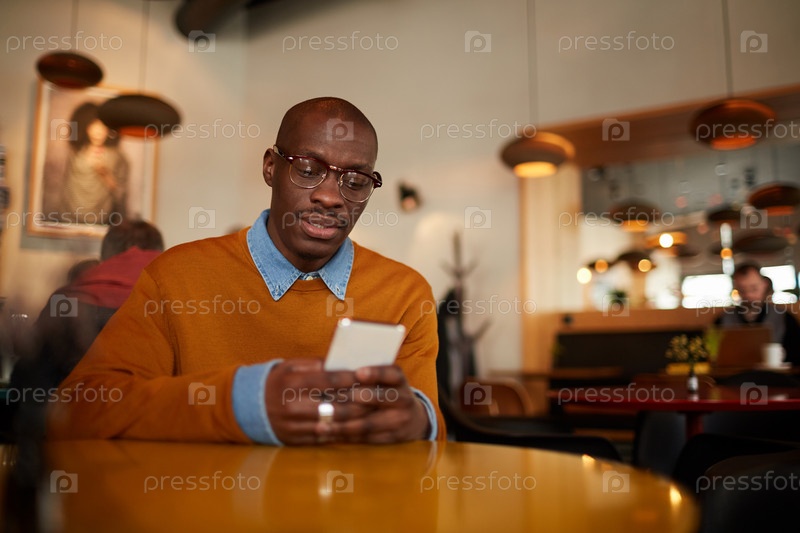 Африканский мужчина использует смартфон в современном кафе