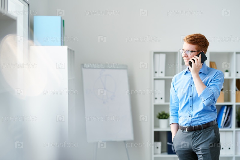 Молодой уверенный в себе бизнесмен разговаривает со своим смартфоном