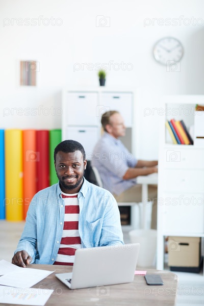 Улыбающийся красивый молодой чернокожий менеджер с бородой сидит за столом и смотрит на камеру, работая с документами и ноутбуком