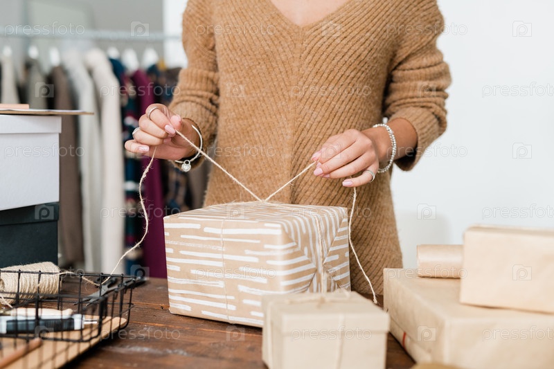 Молодая случайная женщина в вязанном пуловере с связывающей нитью на вершине упакованной подарочной коробки