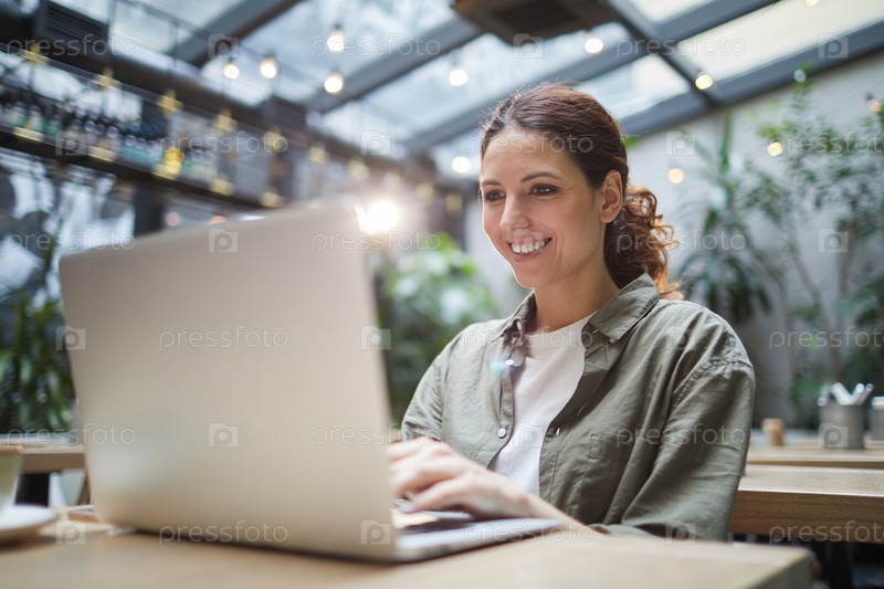Улыбающаяся женщина использует ноутбук в кафе