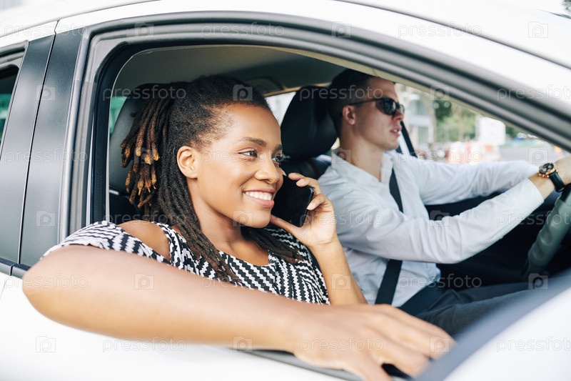 Африканская женщина разговаривает по телефону в машине