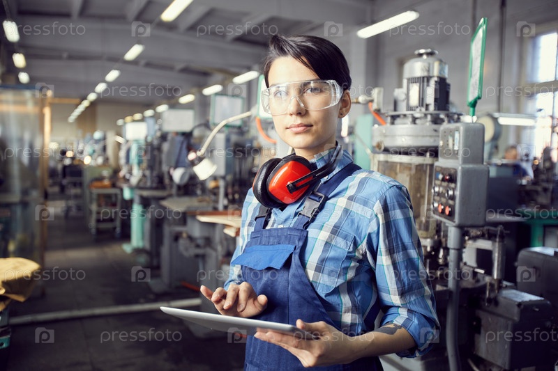 Портрет серьезной молодой брюнетной женщины в защитных очках и синей рабочей одежде, изучающей настройки фабричной машины через приложение для планшетов