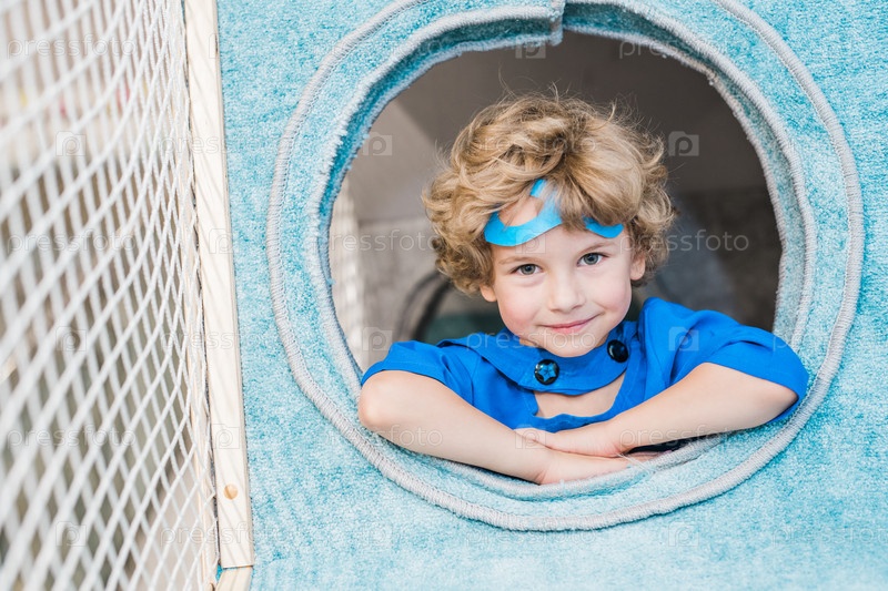 Блондинка кудрявый мальчик в синем костюме Супермена в круглом окне