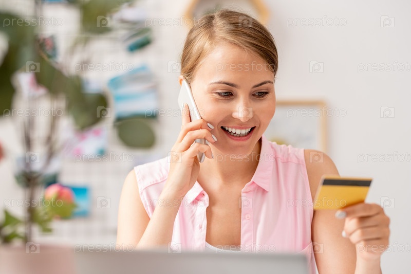 Молодая женщина смотрит на пластиковую карту, делая заказ в интернет-магазине