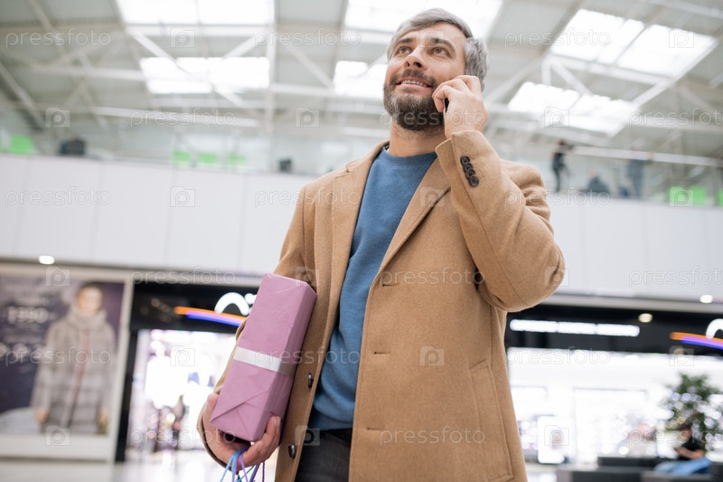 Счастливый бородатый мужчина в пальто, держащий подарочный ящик и разговаривающий с кем-то на смартфоне