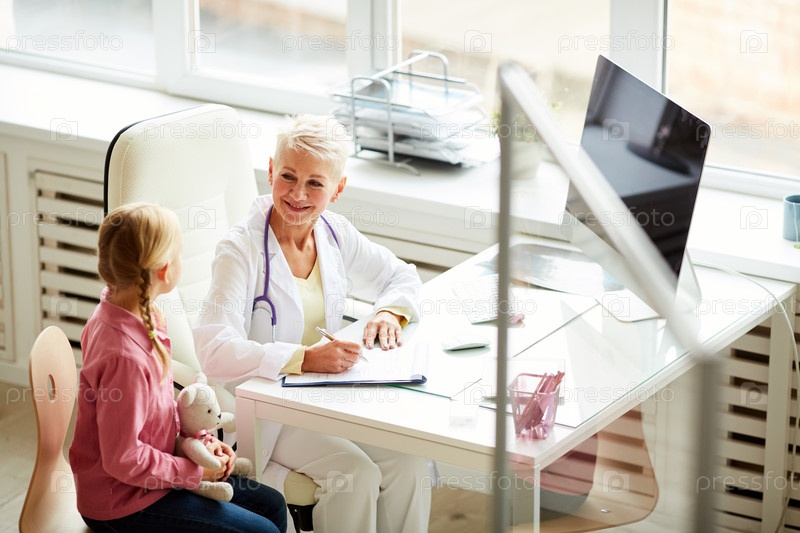 Улыбающийся дружелюбный зрелый блондин-врач со стетоскопом на шее сидит за столом в офисе и разговаривает с маленьким пациентом с игрушкой