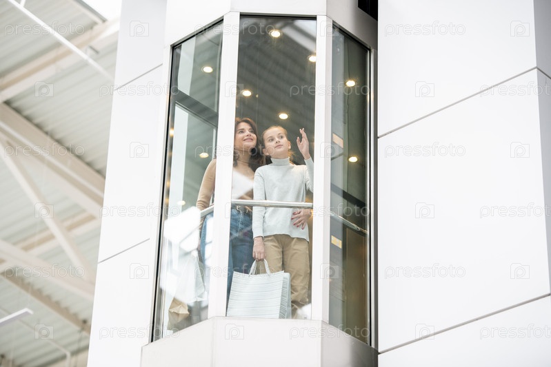 Молодая мать и дочь обсуждают что-то, двигаясь вверх на лифте