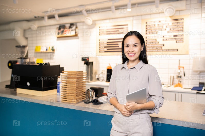 Счастливая молодая брюнетка-официантка стоит у прилавка и ждет вас в кафе