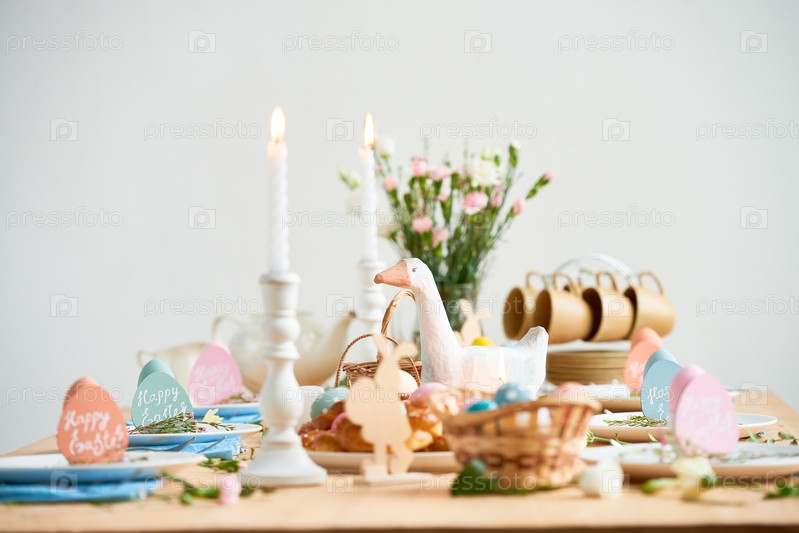 Обеденный стол украшен для празднования Пасхи игрушечной уткой, счастливыми пасхальными открытками на тарелках и цветами
